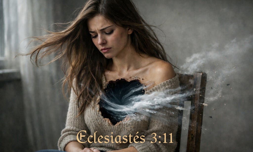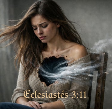 Eternidad en el Corazón del Hombre Basado en Eclesiastés 3:11 Reflexión – Hermana Isabel Texto base Todo lo hizo hermoso a su tiempo, y ha puesto eternidad en el corazón de ellos, sin que alcance el hombre a entender la obra que ha hecho Dios desde el principio hasta el fin. La eternidad dentro del vaso de barro Eternidad dentro de un vaso de barro es algo urgente de saber. Es algo notable. Es algo que requiere explicación. Un vaso de barro abierto por el cual sopla un viento huracanado llamado eternidad. En ese vaso de barro somos nosotros. Cada uno de nosotros somos un vaso de barro, pero no somos solamente eso. El ser humano es tripartito: somos espíritu que posee un alma y vive en un cuerpo. El cuerpo El cuerpo es la parte más fácil de entender del ser humano, porque es lo visible, lo material, aquello con lo que interactuamos en el mundo físico. El alma Cuando nos referimos al alma, la palabra viene del griego 'psique' y del hebreo 'nefesh'. El alma comprende las facultades internas del ser humano. Podríamos decir que el alma se manifiesta a través de lo que conocemos como el universo de tres libras: el cerebro humano. En ese universo de tres libras se despliegan las facultades del alma, teniendo como comandante a los pensamientos. Los pensamientos son la primera ventana, el primer anaquel de ese universo interior. Desde allí se organizan las demás funciones del alma. Esto es algo verdaderamente impresionante y extraordinario. El vacío del alma Cuando en el alma existe un vacío profundo, ese vacío se transfiere a la tercera parte del ser humano: el espíritu. El espíritu El espíritu es la parte del ser humano que muchas personas no comprenden. Es la dimensión espiritual del hombre. Podríamos compararlo con un trono para Dios dentro del ser humano, un lugar donde se levanta un altar, como el arca o el santuario del lugar santísimo. Es allí donde el ser humano encuentra su verdadera conexión con la eternidad.